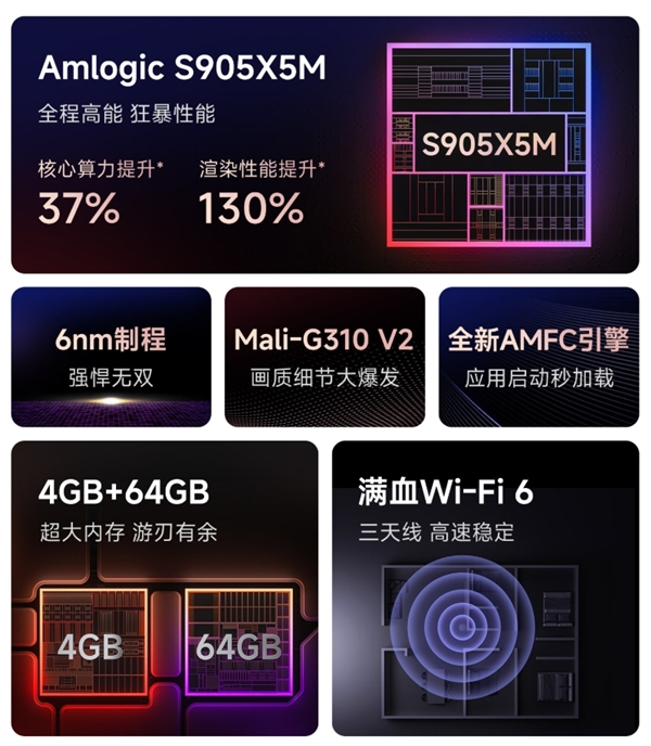 硬件方面搭载Amlogic S905X5M芯片,采用6nm先进制程,内置G310 V2图像处理器,具备8K强悍解码能力,还支持4K@60FPS超高清画质无损输出。